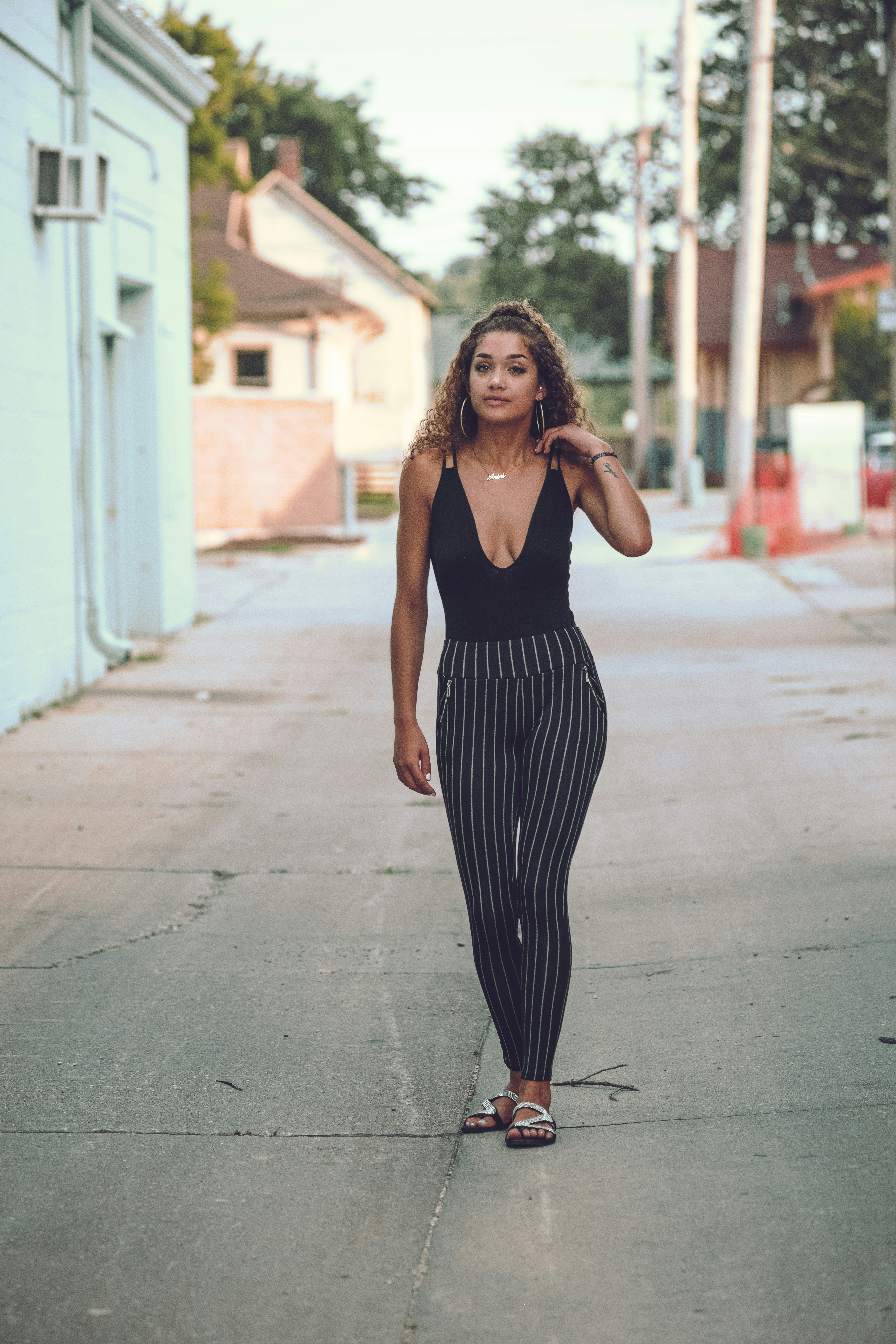 Shallow focus photo of a girl in gray and blue scoop-neck sweater Public. Grey and White Striped Tank with Pink Print.